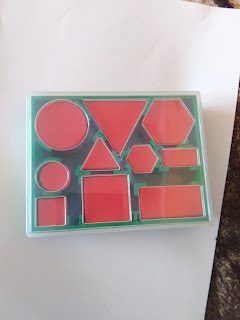 Zamówiłam również figury geometryczne. Nazywa się je różnie: klockami Dienesa, klockami do logicznego myślenia, zestawami geometrycznymi... W tym wypadku produkt nazywał się sorterem, ze względu na pudełko, które umożliwia jego wykorzystanie właśnie w ten sposób. Doskonały jest jednak do tych samych ćwiczeń, które opisałam wcześniej. różnica jest tylko taka, że figury różnią się kształtem, kolorem, wielkością oraz grubością.