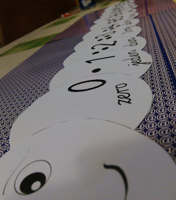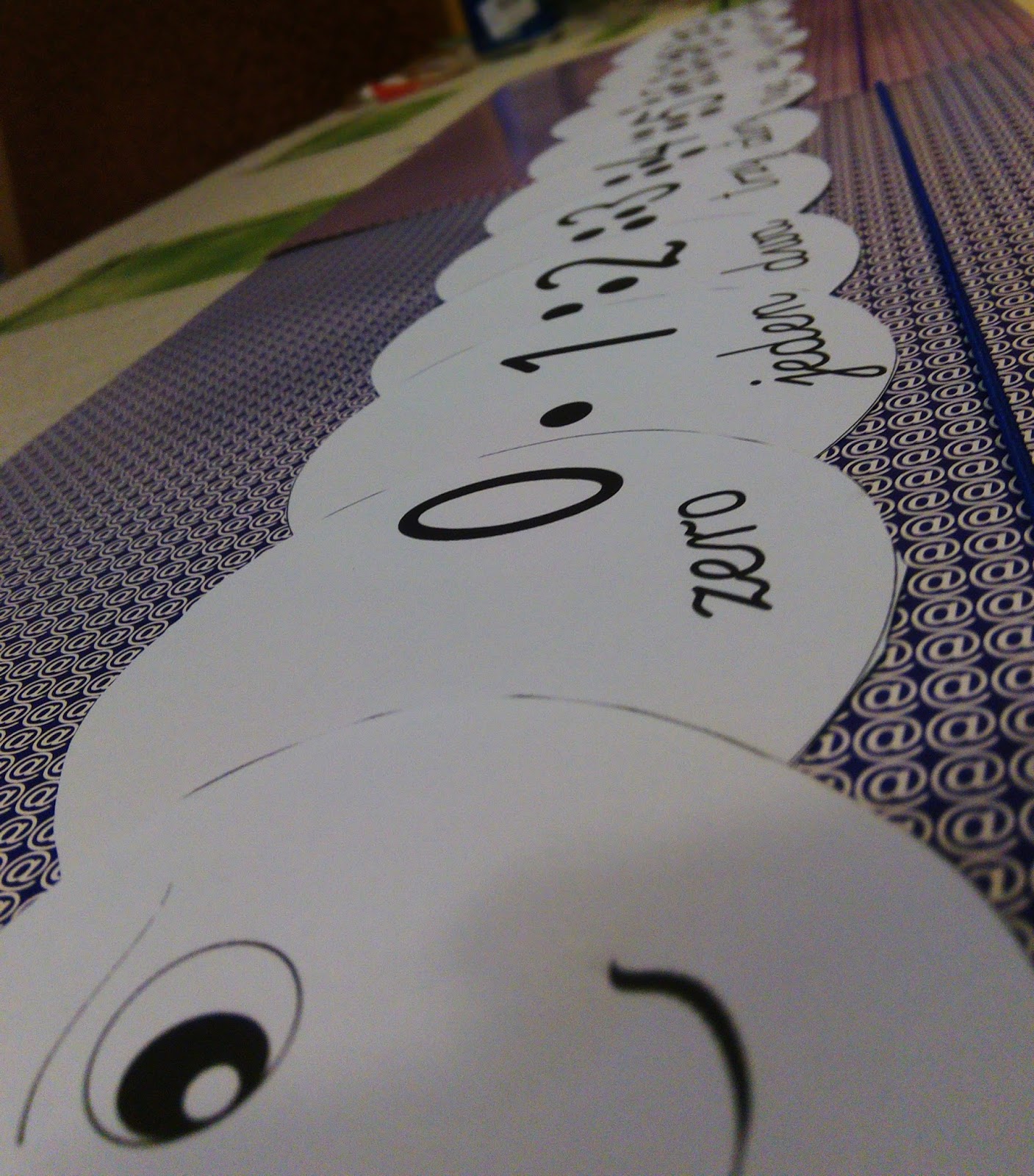 Niewiele tego, stąd zdecydowałam się wykonać coś sama. Moja propozycja na dekorację to liczbowa gąsienica. Każda kolejna "część" tego zwierzątka poświęcona jest innej liczbie wraz z jej zapisem słownym i odpowiednią ilością kropek.