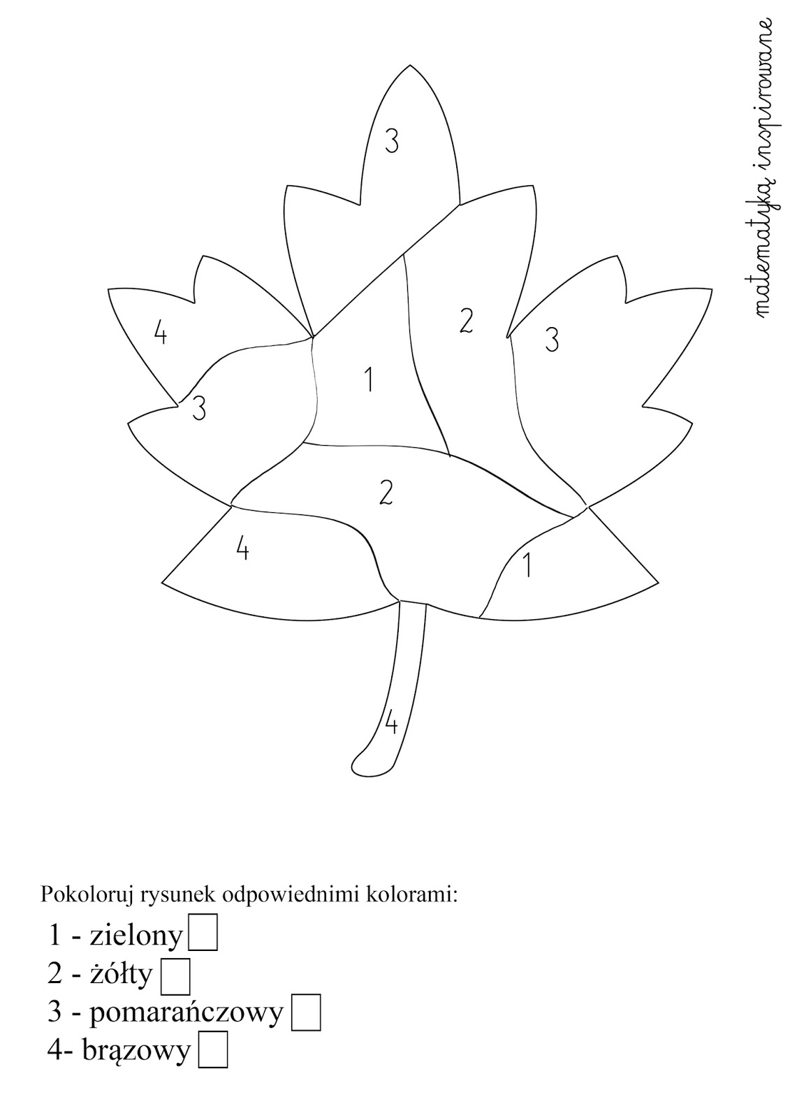 Tym razem jest to właśnie zadanie/karta pracy z dużym liściem, który należy pokolorować według szyfru, kodu. Kolejnym cyfrom odpowiadają różne kolory. Moim zdaniem sprawdzi się w "starszakach". "zerówkach" oraz w klasach 1. Z tego właśnie powodu obok każdej nazwy koloru zamieszczone zostało pole do zaznaczenia odpowiednią kredką danego koloru.