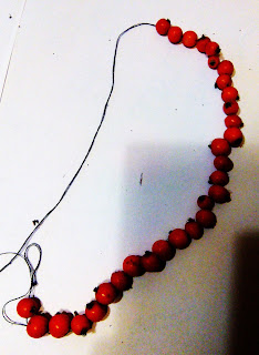 W zasadzie nie różni się od sposobu robienia zwyczajnych korali z jarzębiny. Na początku nawlekamy igłę, odcinamy stosowną ilość nici i wiążemy supełek na jednym końcu. Następnie przy użyciu igły nawlekamy kolejne owoce jarzębiny. Gdy skończymy, wiążemy supeł na drugim końcu. I tyle - bardzo proste i dość szybkie :) Opcjonalnie można np. lakierem do paznokci zaznaczyć koraliki z co drugiej dziesiątki.