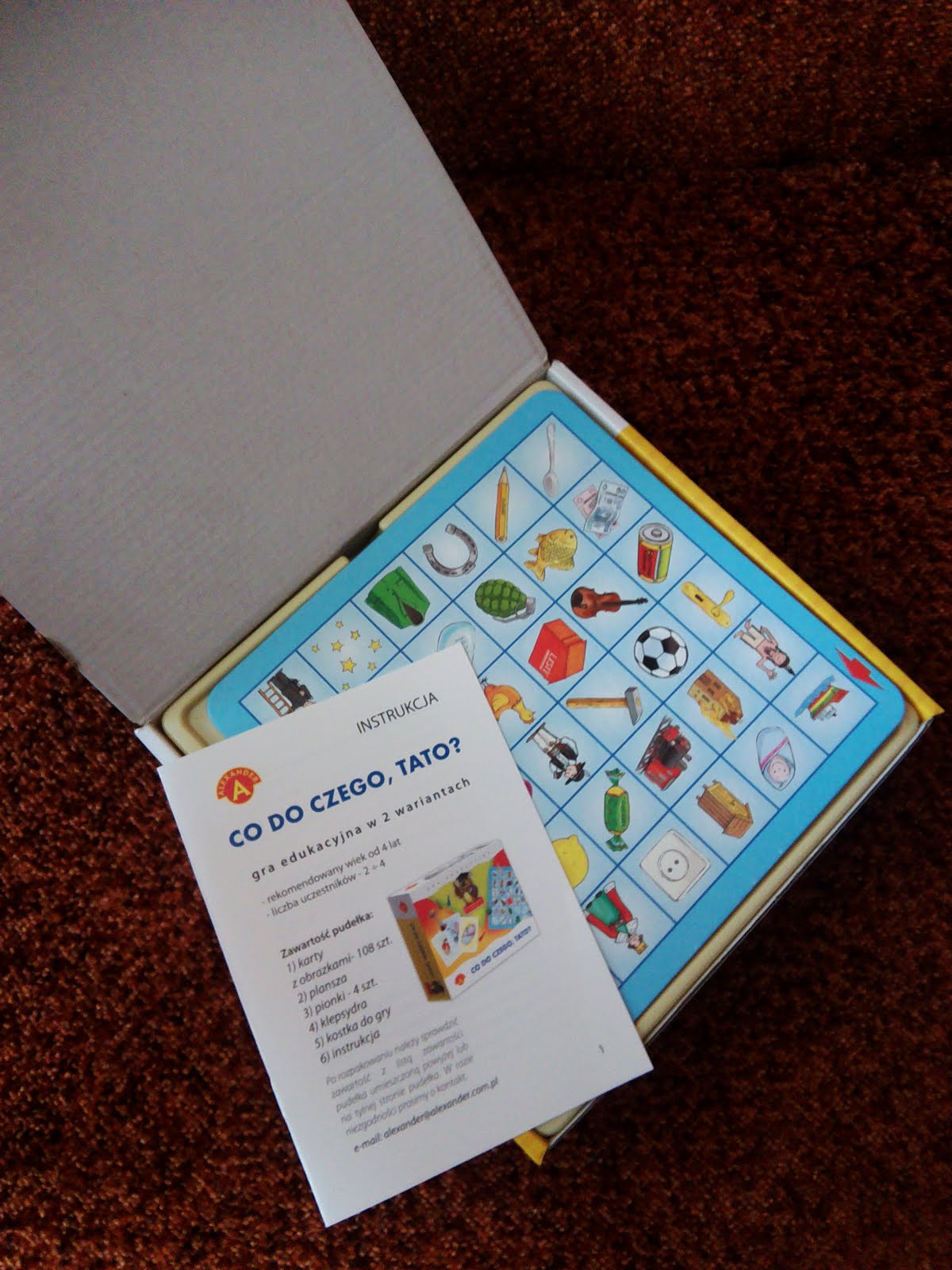 Gra "Co do czego, tato?" z serii "Sowa Mądra Głowa" to, jak możemy przeczytać na stronie wydawnictwa Alexander, "Co do czego tato?" to gra dla dzieci w wieku przedszkolnym- polega na znalezieniu i zebraniu jak największej ilości kart powiązanych z obrazkami umieszczonymi na polach planszy, na których zatrzyma się pionek. Gra rozwija umiejętność logicznego myślenia, wyobraźnię oraz zdolność skojarzeń."