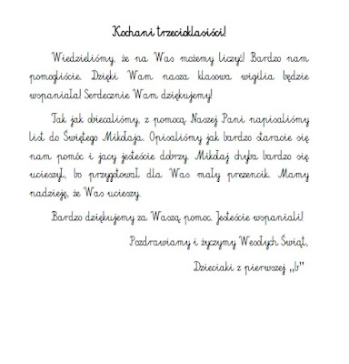 To jednak dopiero początek! Zaraz po tym odkrywamy tajemnicze listy! Od kogo? Dla nas? O co chodzi? List okazuje się być prośbą pierwszaków o pomoc w zorganizowaniu ich wigilii klasowej. Informują o budżecie i potrzebnych produktach. Ba! Nawet obiecują pochwalić klasę przed Świętym Mikołajem! Nie można zatem odmówić... :)