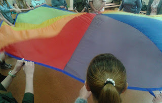 Tak, tak! Wykorzystuję spadochron nawet do matmy! (świetny sposób na ćwiczenie podzielności liczb czy jako... element gry planszowej, w której zamiast pionków wędrują uczestnicy!). Już kiedyś o tym wspominałam i jeszcze nieraz wspomnę. Niech tylko wyjdzie słońce i pozwoli na zabawę;)!