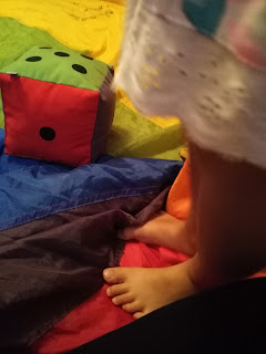 Kostka ma sporo zalet. Jest bardzo miękka, przyjemna w dotyku, sprawia, że chce się jej dotykać. Jest duża, skupia zatem uwagę dzieci. Również jej kolorystyka wzbudza zainteresowanie najmłodszych. A dla mnie ważne jest to, że ma te same kolory co chusta czy spadochron animacyjny. Sprawia to, że mamy nieskończenie wiele możliwości jej wykorzystania. Jest bardzo wytrzymała. Baaardzo wytrzymała... Sprawdzałam :)