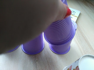 Do 40 plastikowych kubków przykleiłam zalaminowane etykietki z cyframi od 0 do 9. Szczerze nie polecam klejenia kropelką ;) Wydrukowałam i zalaminowałam również karteczki z zapisanymi działaniami. Oprócz tego przygotowałam dwa kubki - zbieraki i tekturowy kubek "bazę".